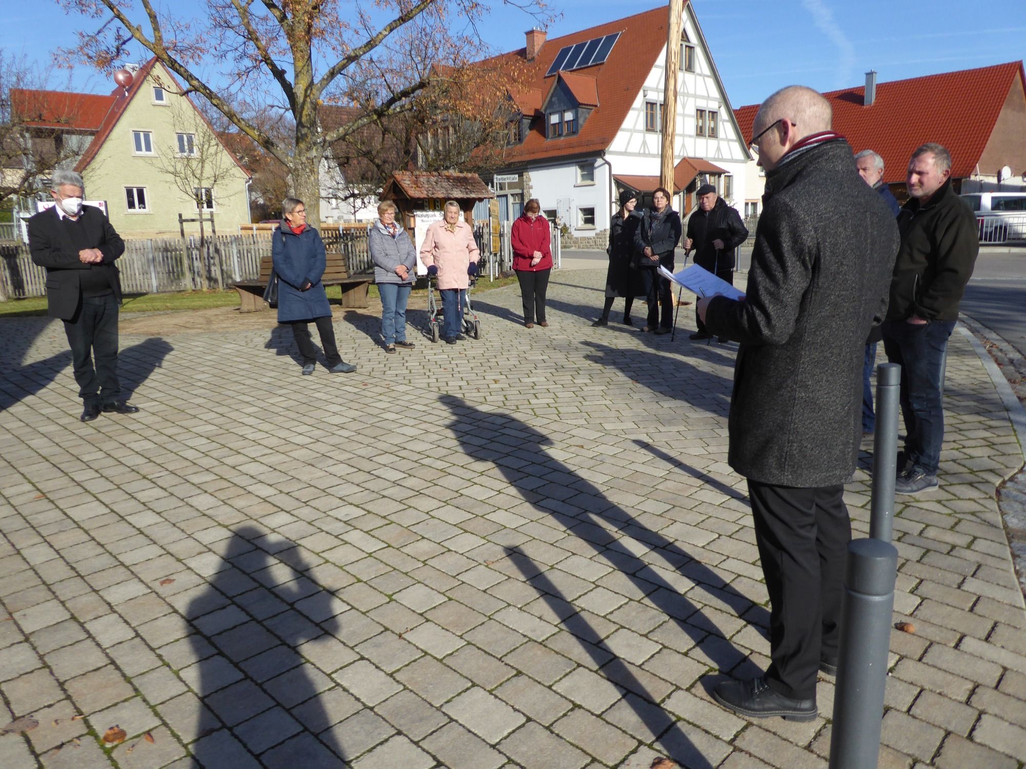 Der Bürgermeister von Iphofen, Dieter Lenzer, begrüßte und dankte den Beteiligten. Er verwies auf den 83. Jahrestag der am 9.11.1938 stattgefundenen Reichspogromnacht, verbunden mit der Mahnung eines „Nie wieder“. In diesem Sinne appellierte auch der stellvertretende Landrat Robert Finster und betonte die Bedeutung einer stabilen Demokratie. Stadtarchivarin Susanne Kornacker skizzierte die Archiv- und Forschungssituation zur jüdischen Geschichte des Ortes und betonte die große Bereitschaft aller Beteiligten, an diesem Projekt mitzuarbeiten. Durch die Einbindung der Schule sei ein wichtiger Beitrag zur historischen Bildungsarbeit geleistet worden. Die Techniklehrerin Nina Sahlmüller sowie ein Schüler berichteten über die Arbeit an den Koffern mit dem Bildhauer Sascha Fidyka, der handwerkliche Details ergänzte. Auch die Schule mit allen Beteiligten sei dankbar für dieses Projekt gewesen. Schließlich verlas Pfarrer i.R. Hans Schlumberger, der in der Reihe „Mehr als Steine … Synagogen-Gedenkband Bayern“ den Artikel über Nenzenheim verfasst hat, die Namen aller ursprünglich aus dem Ort stammenden Opfer, auch wenn diese zwischenzeitlich verzogen waren. Schließlich verlas Susanne Kornacker einen Psalm in deutscher und hebräischer Sprache. Zum Abschluss der Gedenkstunde enthüllte Bürgermeister Lenzer den Koffer.