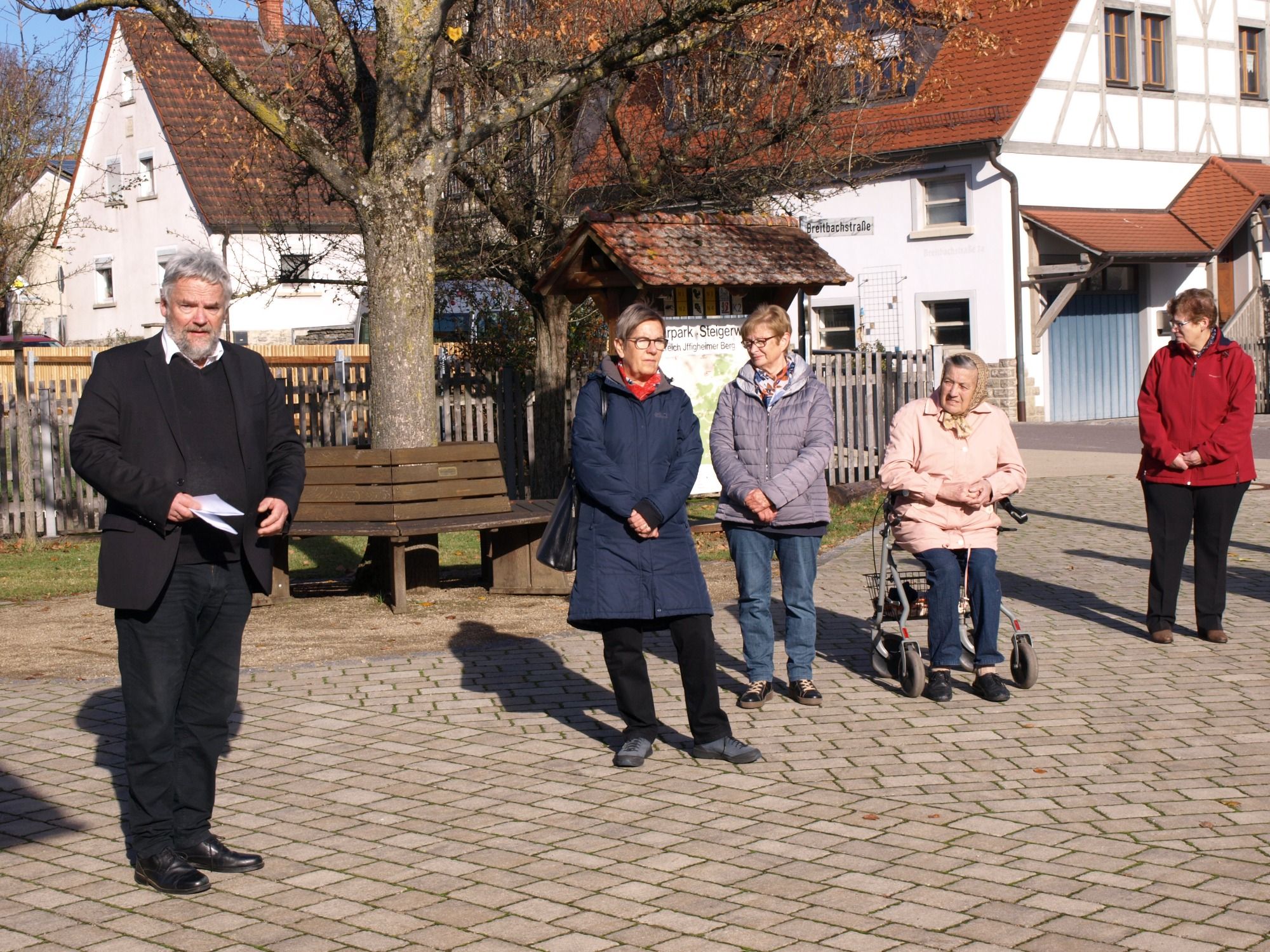 Es waren Bürgerinnen und Bürger aus Nenzenheim samt den Stadträten aus Nenzenheim, Bürgermeister Dieter Lenzer und Stadtarchivarin Susanne Kornacker aus Iphofen, der stellvertretende Kitzinger Landrat Robert Finster, Benita Stolz vom Projekt DenkOrt Deportationen Würzburg, Frau Karl vom Förderverein ehemalige Synagoge Kitzingen e.V., ein Teil der beteiligten Schülerinnen und Schüler der Dr.-Karlheinz-Spielmann Mittelschule Iphofen mit ihrer Techniklehrerin Nina Sahlmüller sowie dem Bildhauer Sascha Fidyka und Hausmeister Stefan Lenzer, Pfarrer i.R. Hans Schlumberger sowie Gerhard Bauer und Timo Lechner als Vertreter der Presse anwesend.